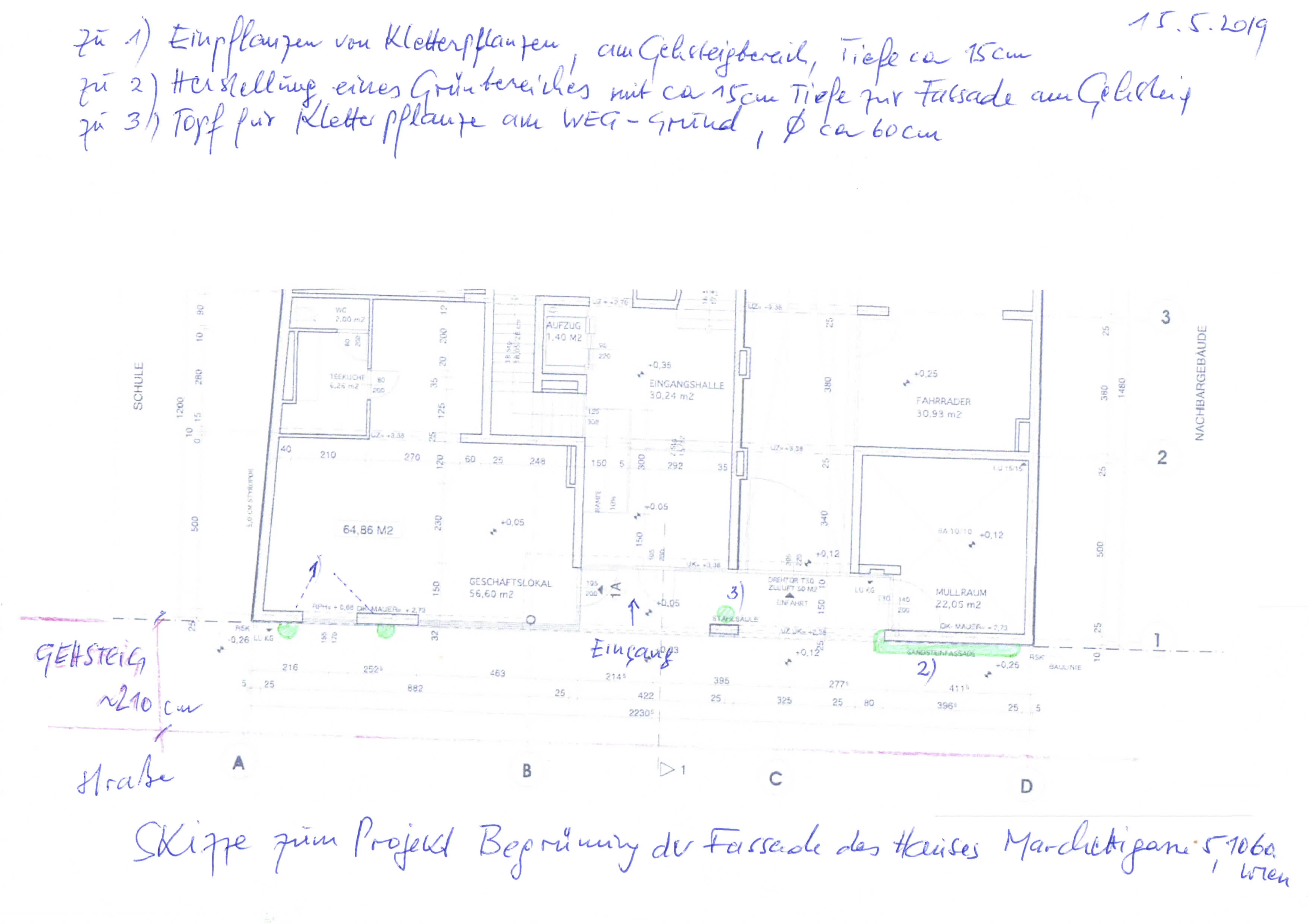 Im Mai 2019 erstellte unsere Hausverwaltung (HVw) erstmals eine Handskizze. Das Haus hatte noch keine Jallousien vor den Fenstern. Daher wollten wir die gesamte Fassade bis ins 3. OG hinauf begrünen. Bei dieser, in Summe großen Blattoberfläche wäre eine direkt im Erdreich wurzelnde Kletterpflanze die erste Wahl gewesen, was in einer von der MA 28 im August 2019 abgehaltenen »Projekt- und Einbautenbesprechung« resultierte. Eingeladen waren 36 verschiedene Magistratsabteilungen und Infrastrukturbetreiber – der Besprechungssaal war gut gefüllt.