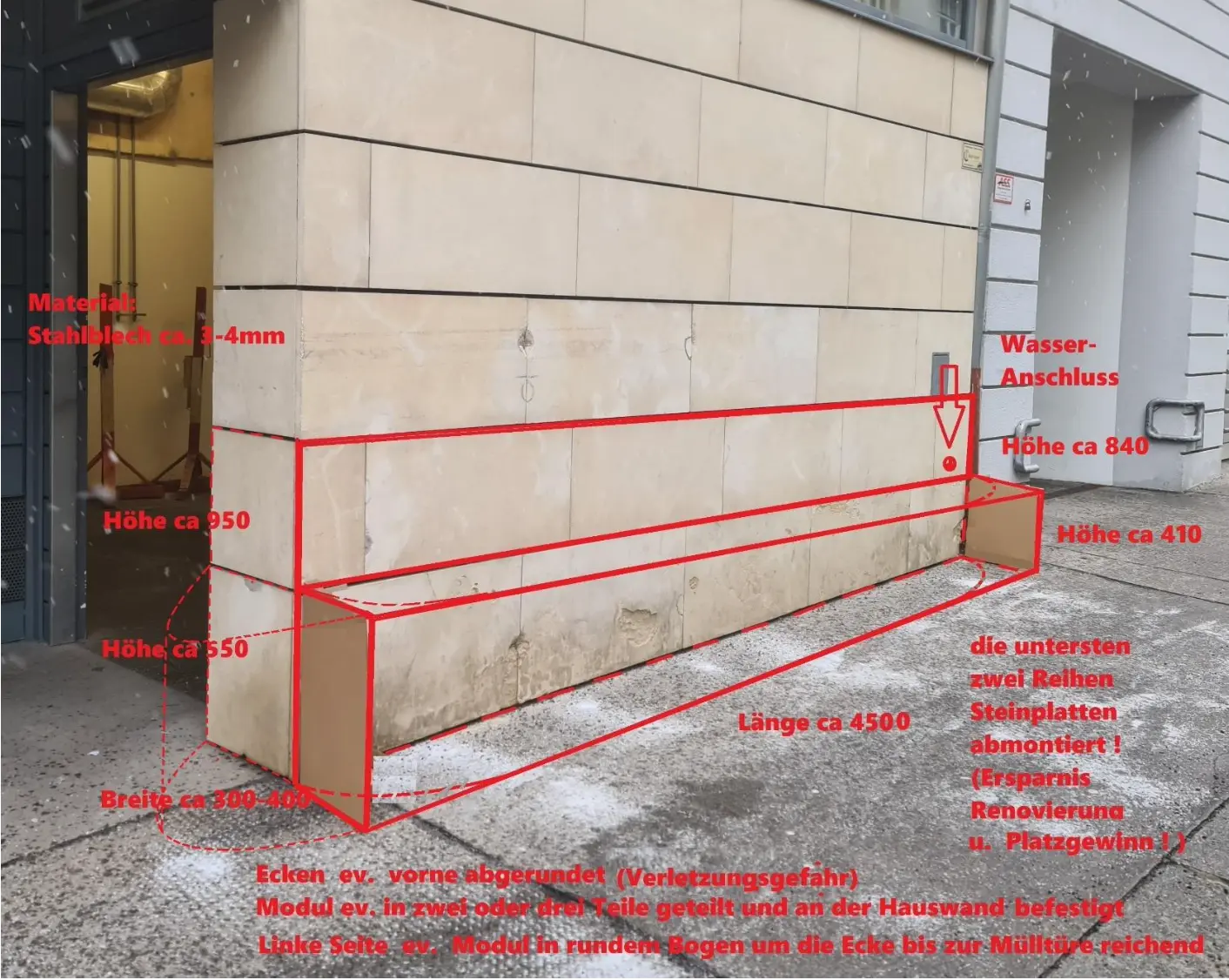 Jänner 2023: Ein Eigentümer erstellt einen Skizze, nach der erstmals nicht nur einzelne Töpfe aufgestellt werden würden. Diese Variante sollte sich letztendlich durchsetzen.