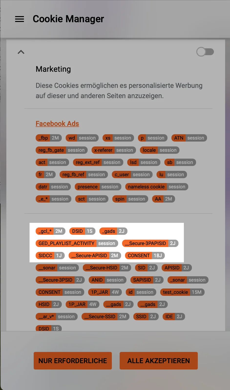 In einem Cookie-Manager-Screenshot der Petitionsplattform mein #aufstehen Mehr über Petitionsplattformen → Petitionsplattformen im Check finden wir Marketing-Cookies von Facebook Ads und weiteren Werbediensten. Wir greifen uns eines davon heraus: das DSID-Cookie, ein Tracking-Cookie, das von DoubleClick, einer Tochtergesellschaft von Google, bereitgestellt wird. Das DSID-Cookie wird verwendet, um Nutzer zu identifizieren und ihnen personalisierte Werbung zu zeigen. Es verknüpft die Aktivitäten der Nutzer auf verschiedenen Websites mit einem zentralen Google-Konto.